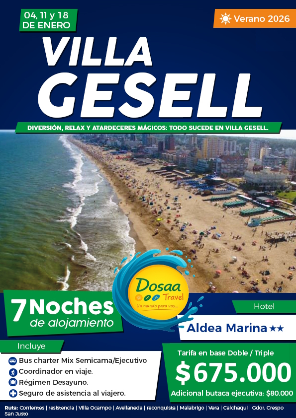 VILLA GESELL 2026 Enero y Febrero 2026 Salidas desde Corrientes – Resistencia -Terminal Fechas de salida todos los DOMINGOS de verano 2026